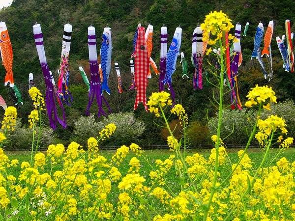 Пожалуй, самым запоминающимся событием дня мальчиков являются карпы (кои-нобори), которые символизируют силу и мужество юноши. Карпы не живые, а тряпичные, и вывешивают их на длинных палках из окон и на крышах домов, чтобы они развевались на ветру. Обычно количество карпов и их размер перекликаются с количеством и возрастом сыновей, но иногда вешают и просто так, за компанию. Говорят, что изначально праздник отмечался среди самураев, которые вывешивали знамёна в честь будущих воинов. Японцам попроще иметь своё знамя было запрещено, вот они и ограничивались карпами. Самураи и знамёна исчезли, а карпы остались: у истории всегда было оригинальное чувство юмора.
